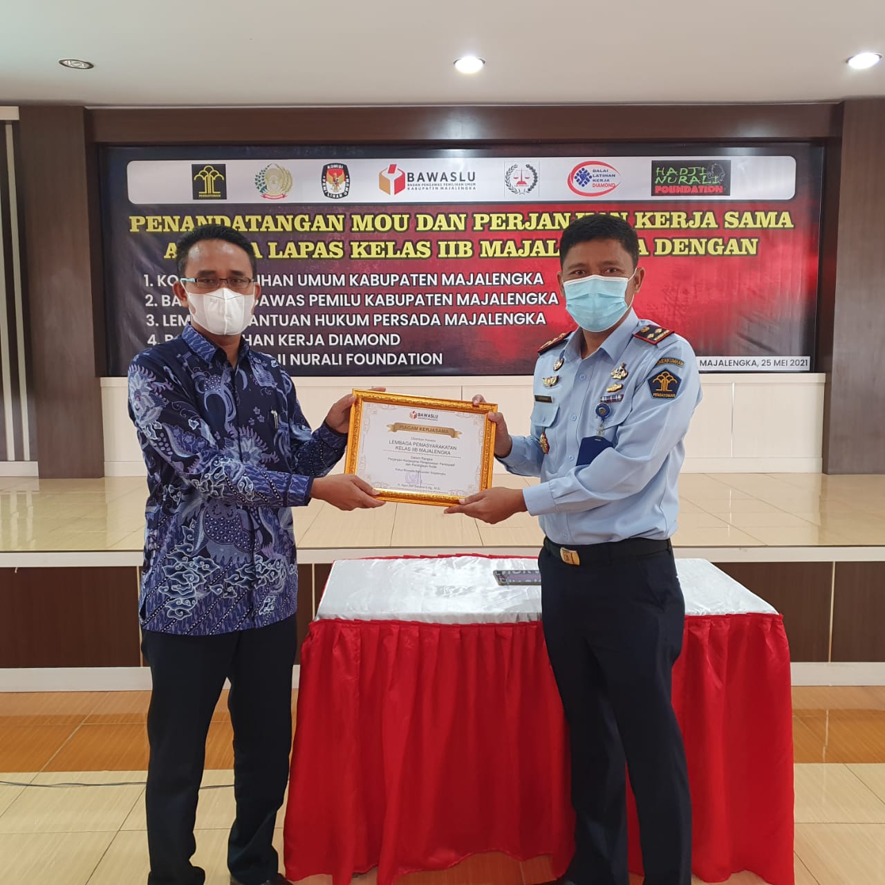Ketua Bawaslu Kabupaten Majalengka saat memberikan Piagam MoU kepada Kepala Lapas Majalengka , Selasa 25 Mei 2021/Foto: Humas Bawaslu Majalengka.