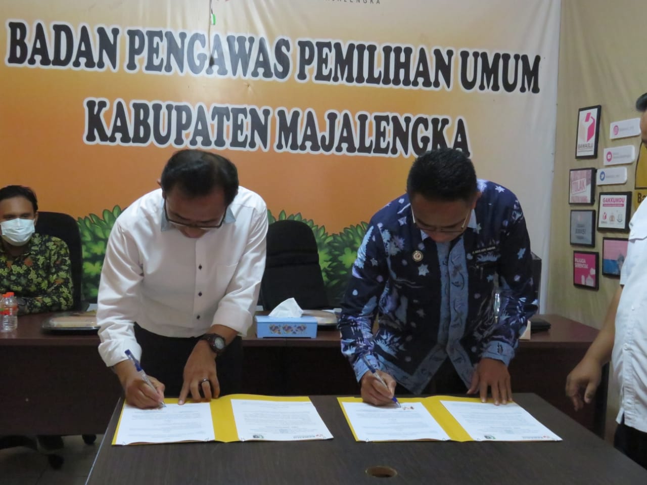 Majalengka - kembali lakukan upaya penguatan lembaga dalam persiapan menghadapi Pemilu dan Pemilihan yang akan datang, Bawaslu Kabupaten Majalengka lakukan penandatangan perjanjian kerjasama bersama DPD PGMI Majalengka, MD KAHMI Majalengka dan Karang Taruna Majalengka di Ruang Rapat Bawaslu Majalengka, Rabu (1/12/2021).
