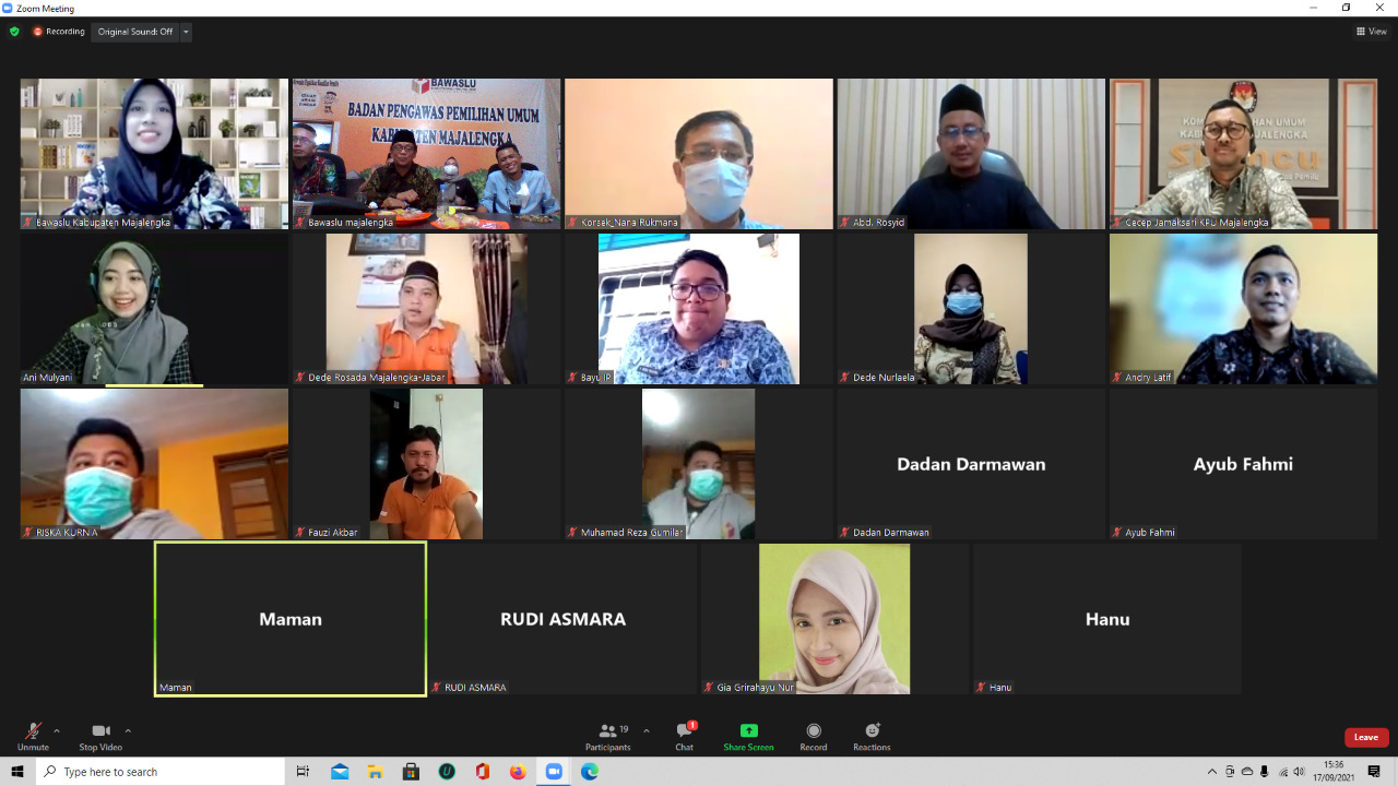 Majalengka-Bawaslu Kabupaten Majalengka menyelenggarakan kegiatan rapat dalam kantor (RDK) Divisi SDM dan Organisasi dengan mengusung tema "identifikasi potensi permasalahan dalam proses pembentukan penyelenggara ad-hoc dalam pemilu serentak 2024". dilaksanakan secara daring, Jum'at (17/09/2021).