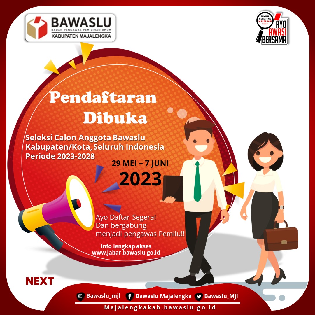 Dalam rangka pembentukan Bawaslu Kabupaten Kota di Wilayah Jawa Barat, maka Tim Seleksi Calon Anggota Bawaslu Kabupaten Kota di Wilayah Jawa Barat berdasarkan Surat Keputusan Ketua Bawaslu Nomor 325/KP.01.00/K1/04/2023 atas kewenangan yang diberikan oleh Undang – Undang Nomor 7 Tahun 2017 tentang Pemilihan Umum membuka kesempatan bagi Warga Negara Indonesia yang memenuhi persyaratan untuk mendaftarkan diri sebagai calon anggota Bawaslu Kabupaten Majalengka Periode 2023 – 2028.